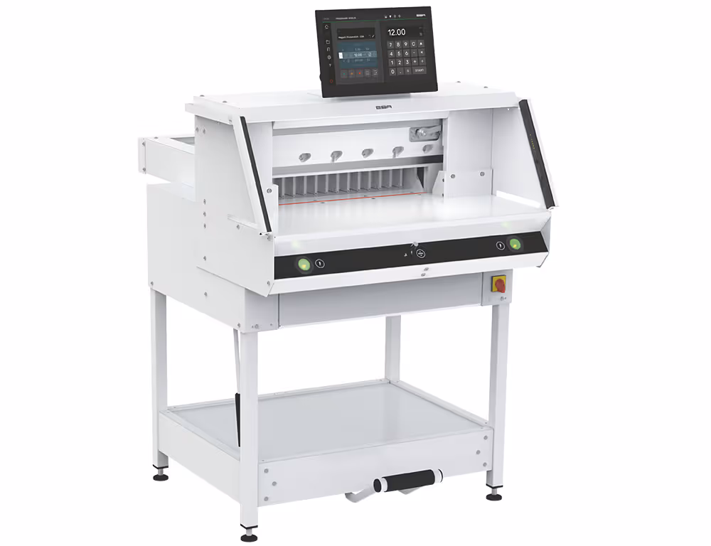 Next-generation programmable powered guillotine – for increased efficiency and productivity by working smarter. With IR light beam safety curtain and hydraulic clamp drive.