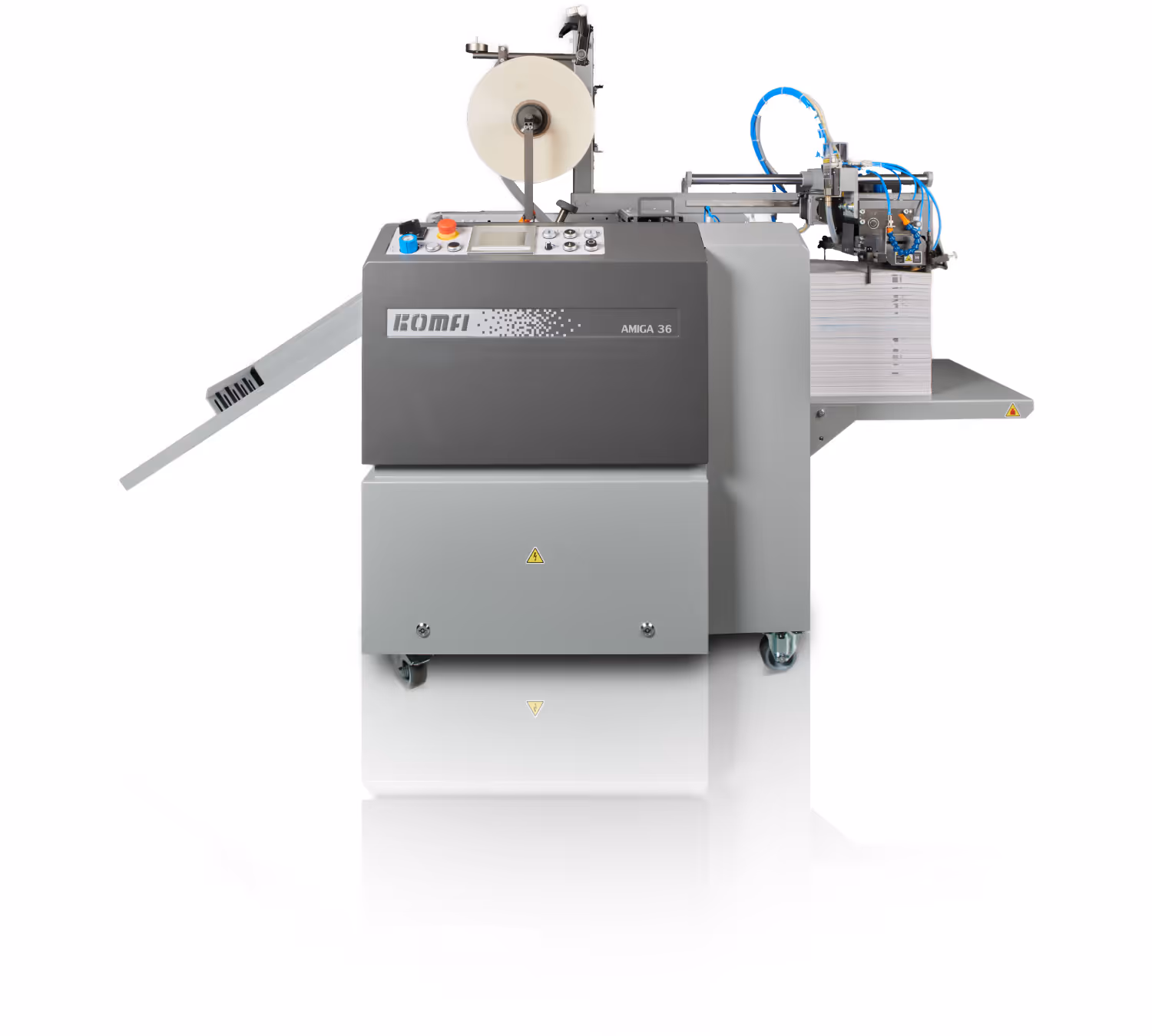 The Komfi Amiga 36 Laminator combines advanced technology with user-friendly design to deliver exceptional lamination performance. Available with two feeder options, top-pile feeding head or bottom suction feeding—the system ensures smooth, uninterrupted operation while maintaining sheet order. Its intelligent control system features advanced built-in functions and a vibrant color touchscreen display, complemented by a set of ergonomic buttons designed to meet industry standards. Perfect for professional environments, the Amiga 36 offers precision, efficiency, and flexibility for a wide range of lamination needs.